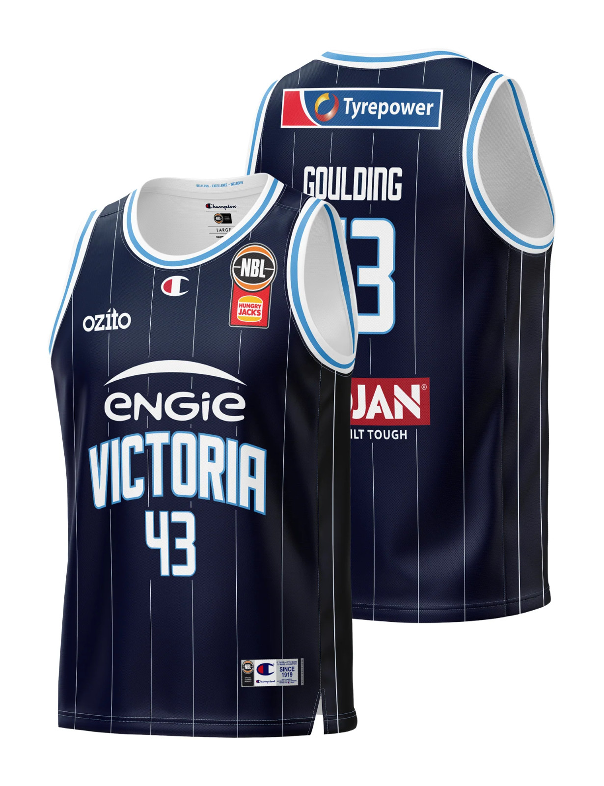 Melbourne United 2024-25 Heritage-Trikot, hergestellt von Champion und in der NBL-2024-2025-Saison getragen. Das Melbourne United 2024-2025 Heritage-Trikot wird mit 3,5 von 5 Sternen bewertet