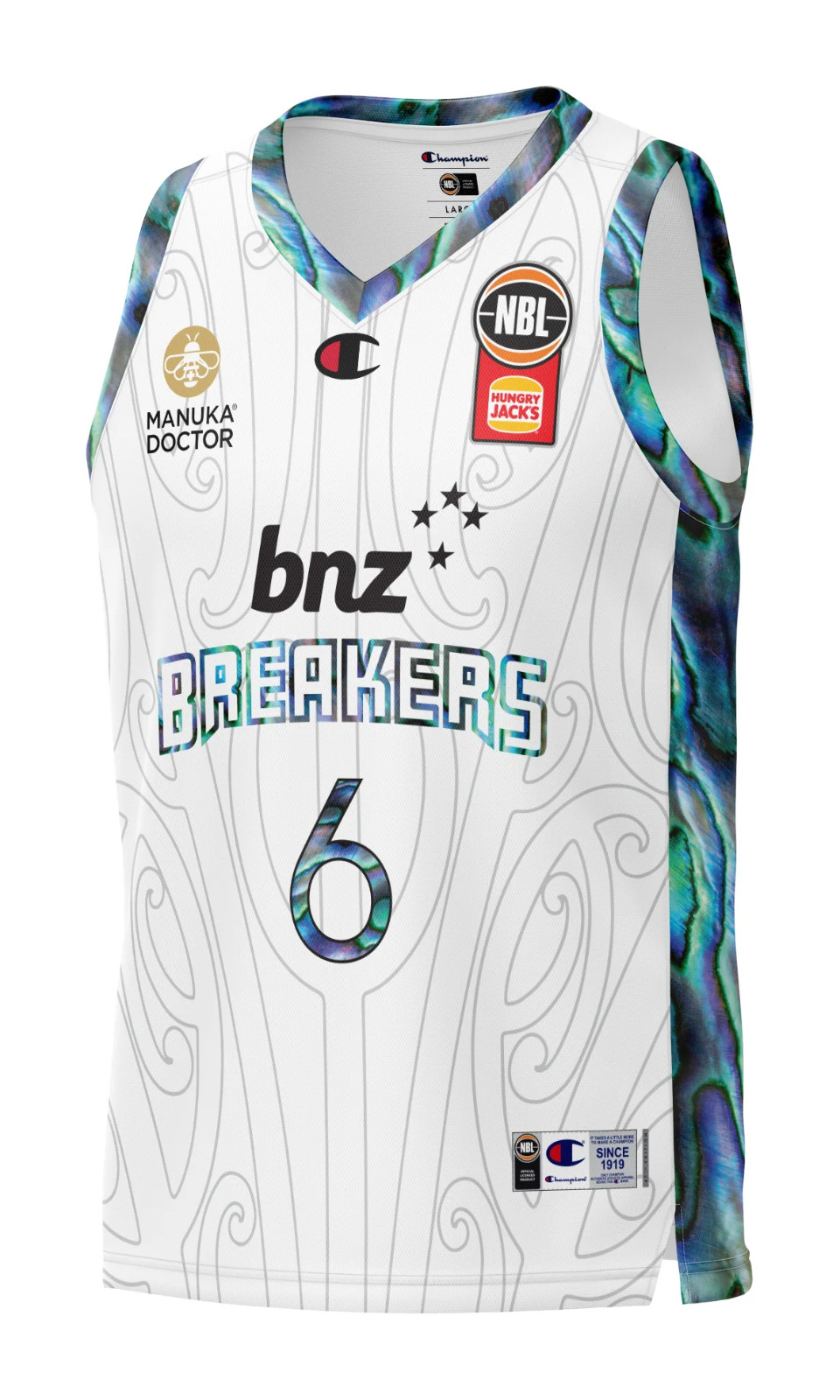 New Zealand Breakers 2024-25 Indigenous-Trikot, hergestellt von Champion und in der NBL-2024-2025-Saison getragen. Das New Zealand Breakers 2024-2025 Indigenous-Trikot wird mit 4,8 von 5 Sternen bewertet