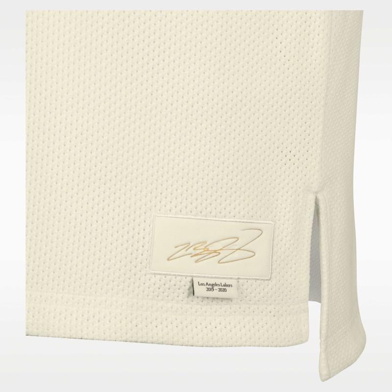 A closer look at the jock tag reveals the specific intent behind the design as it features a premium cream-colored patch with LeBron James' signature engraved in gold. Directly below the signature is the text "Los Angeles Lakers 2019-2020," explicitly connecting this piece to the team's 17th NBA Championship season in the Orlando Bubble.