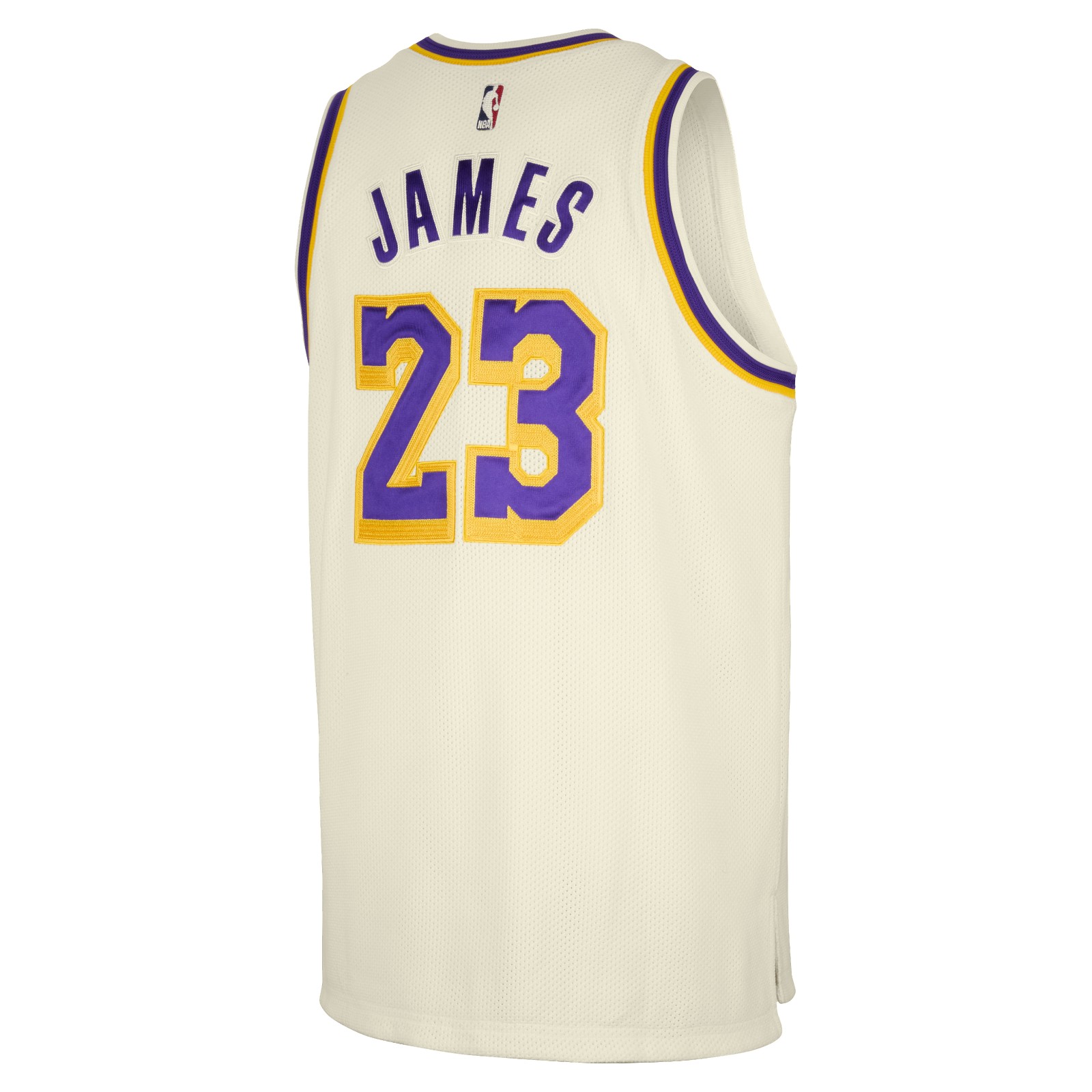 The jersey utilizes a vintage-inspired off-white mesh rather than the standard bright white used for home uniforms. The design maintains the classic "Lakers" identity with the wordmark and number #23 rendered in purple tackle twill with gold embroidery.