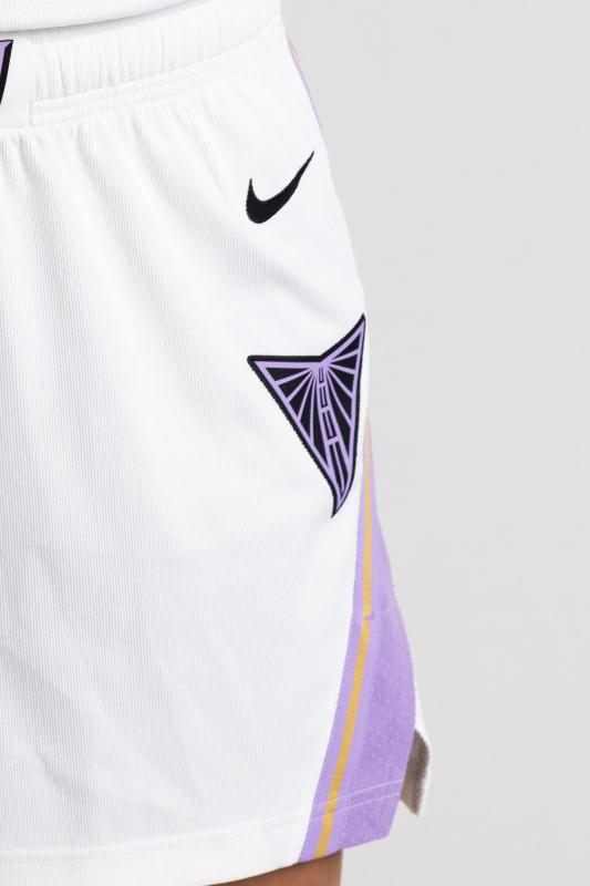 The Golden State Valkyries 2026 Heroine Jersey is mainly white and features the "VALKYRIES" wordmark across the chest in a sharp, jagged black font.The design is framed by a purple V-neck collar and purple and gold armhole trim, effectively highlighting the franchise's new primary colors.