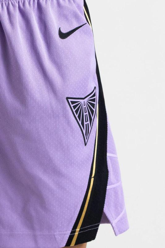 The Golden State Valkyries 2026 Explorer Jersey is mainly purple and utilizes a bold, block-lettered "GOLDEN STATE" wordmark in black. The uniform is rounded off with black-and gold armholes design and a black v-neck collar., providing a premium look that replaces the team's inaugural debut designs after just one season.