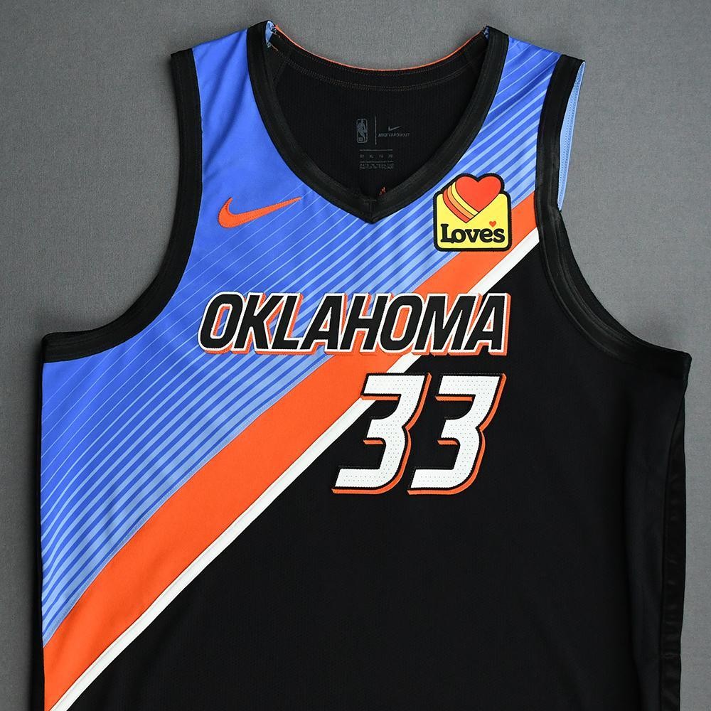 Oklahoma City Thunder 2020-21 City-Trikot, hergestellt von Nike und in der NBA-2020-2021-Saison getragen. Das Oklahoma City Thunder 2020-2021 City-Trikot wird mit 3,2 von 5 Sternen bewertet