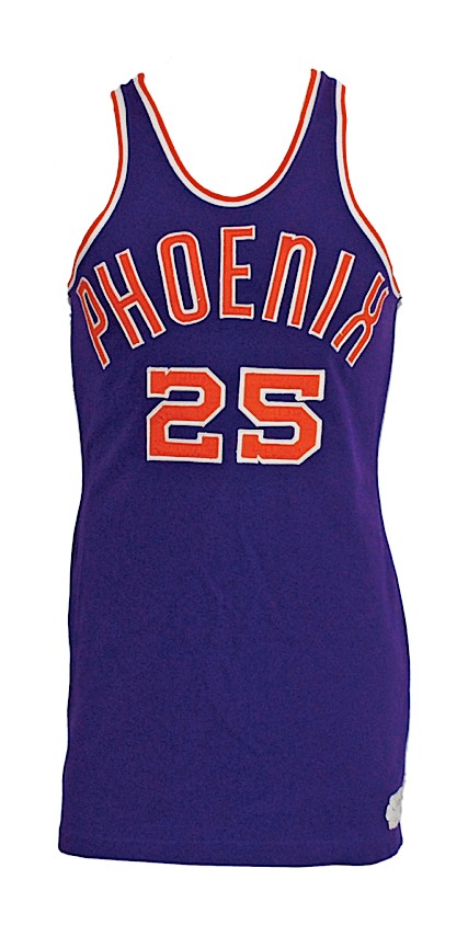 Phoenix Suns 1968-70 Away-Trikot, hergestellt von Spanjian und in der NBA über 2 Jahre zwischen 1968 und 1970 getragen. Das Phoenix Suns 1968-1970 Away-Trikot wird mit 2,1 von 5 Sternen bewertet