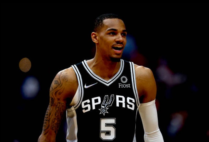 Spieler Derrick White, Jakob Poeltl, Tre Jones, Dejounte Murray, Keldon Johnson und Devin Vassell.