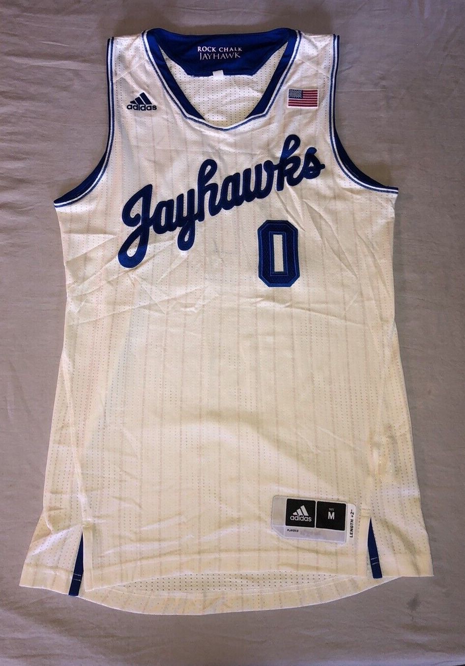 Uniforme Kansas Jayhawks 2018-19 Alternate 1, confeccionado de adidas y utilizado en la temporada NCAA 2018-2019. El Kansas Jayhawks 2018-2019 Alternate 1 jersey está valorado con 3,8 estrellas sobre 5.