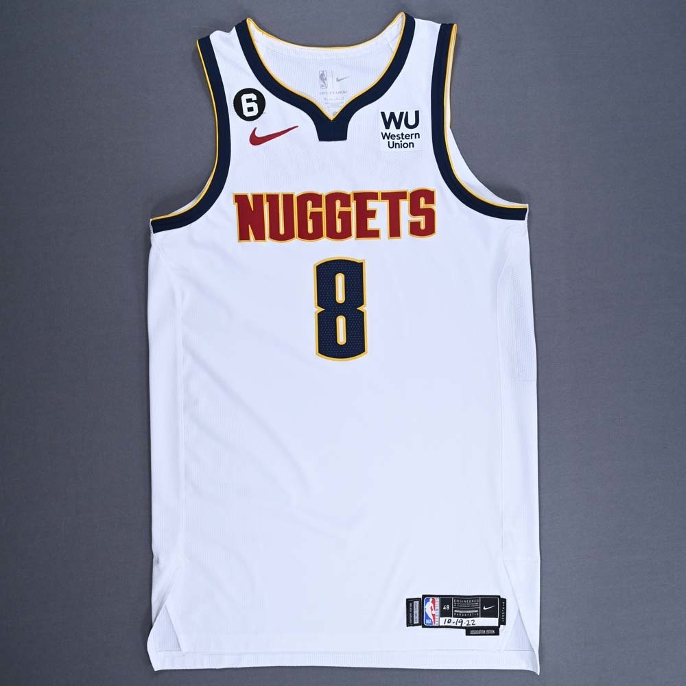 Uniforme Denver Nuggets 2022-23 Association, confeccionado de Nike y utilizado en la temporada NBA 2022-2023. El Denver Nuggets 2022-2023 Association jersey está valorado con 2,6 estrellas sobre 5.