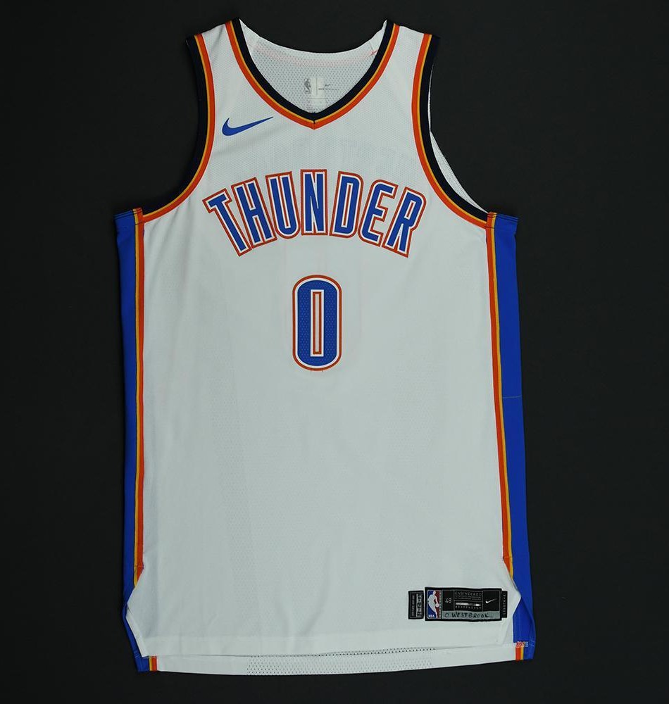 Uniforme del Oklahoma City Thunder 2017-19 Association, fabricado el de Nike y utilizado en el NBA durante 2 años entre el 2017 y el 2019. El Oklahoma City Thunder 2017-2019 Association jersey está valorado con 3,0 estrellas sobre 5.
