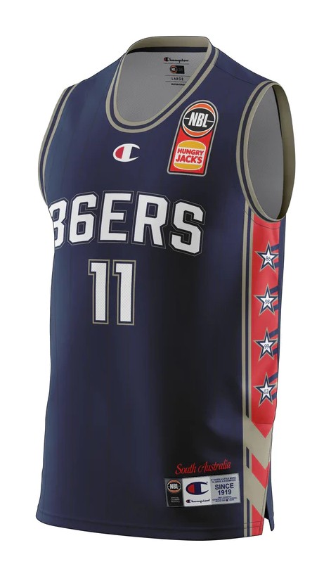 Uniforme Adelaide 36ers 2021-22 Home, confeccionado de Champion y utilizado en la temporada NBL 2021-2022. El Adelaide 36ers 2021-2022 Home jersey está valorado con 4,0 estrellas sobre 5.