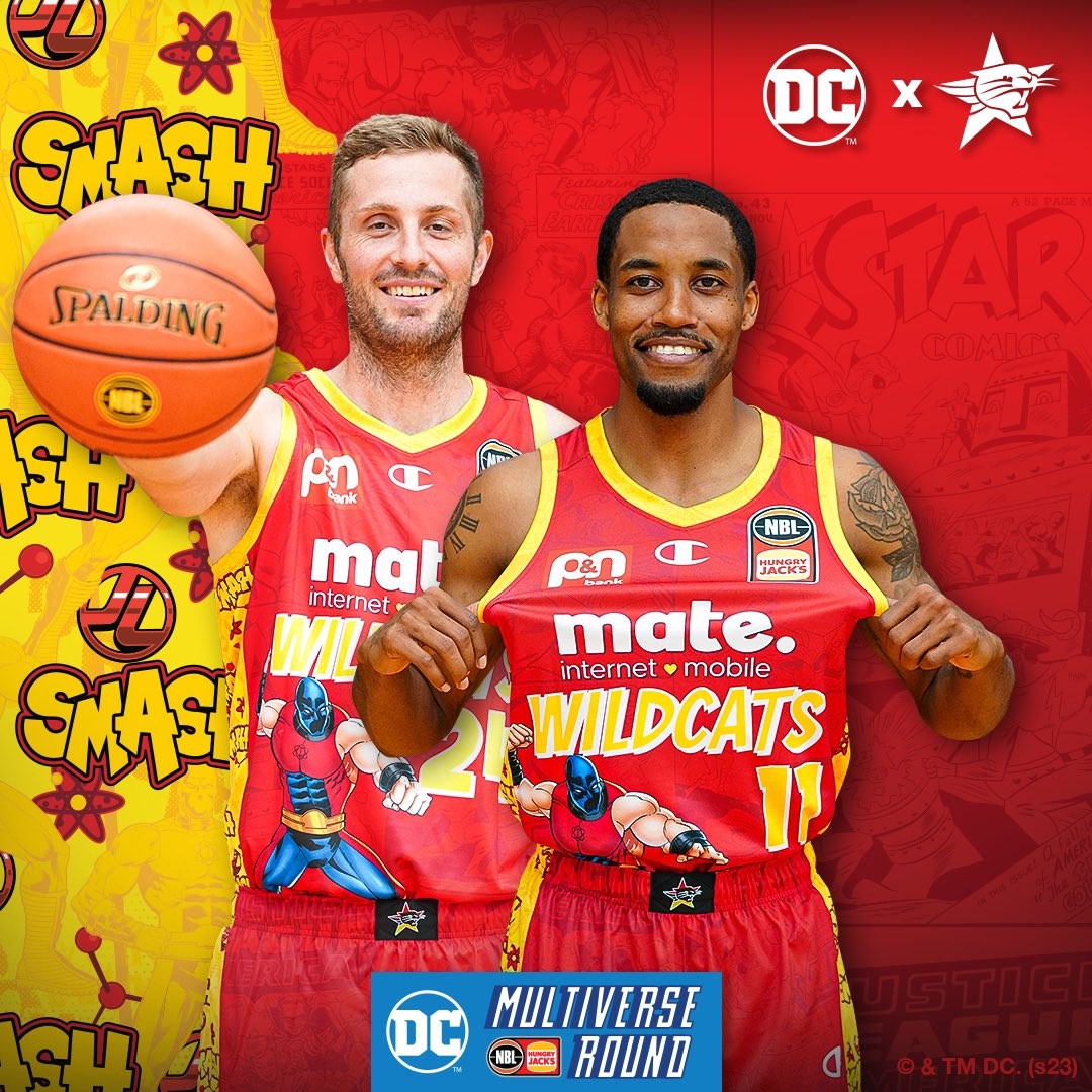 Le maillot et le short officiels NBL X DC des Perth Wildcats présentent le personnage clé Atom Smasher sur le devant et ...