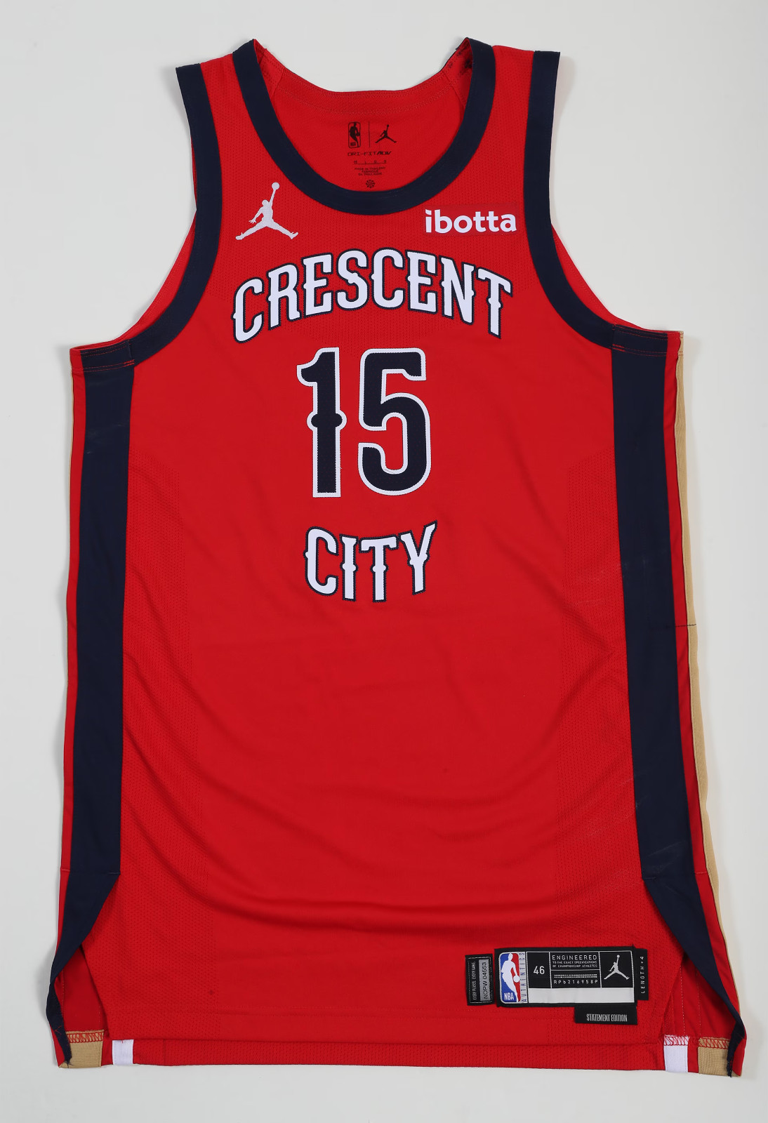 Seragam New Orleans Pelicans 2023-26 Statement, dibuat oleh Air Jordan dan dikenakan di NBA selama 3 tahun antara 2023 dan 2026. Seragam New Orleans Pelicans 2023-2026 Statement dinilai dengan 2.3 bintang dari 5 bintang.