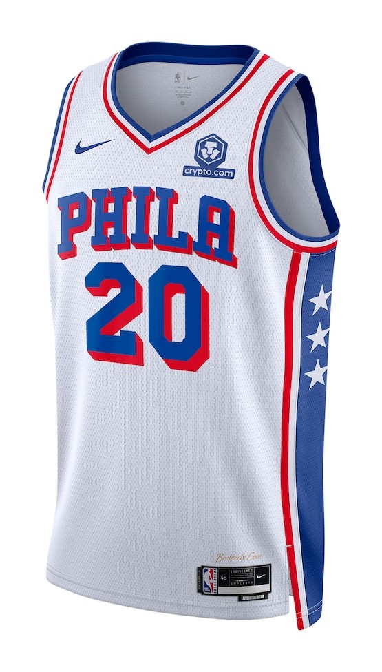 Divisa Philadelphia 76ers 2023-26 Association, realizzata da Nike e indossata nelle NBA per 3 anni tra le 2023 e le 2026. La maglia Philadelphia 76ers 2023-2026 Association è valutata con 3,7 stelle su 5.