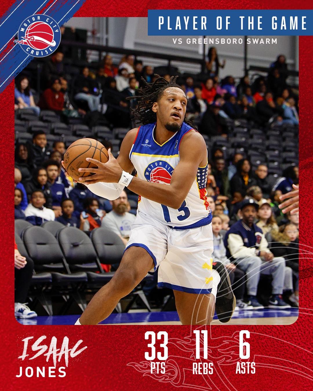 Motor City Cruise 2025-26 Detroit Flag uniform, made in-house and worn in the 2025-2026 season. The Motor City Cruise 2025-2026 Detroit Flag jersey is rated with - stars out of 5.