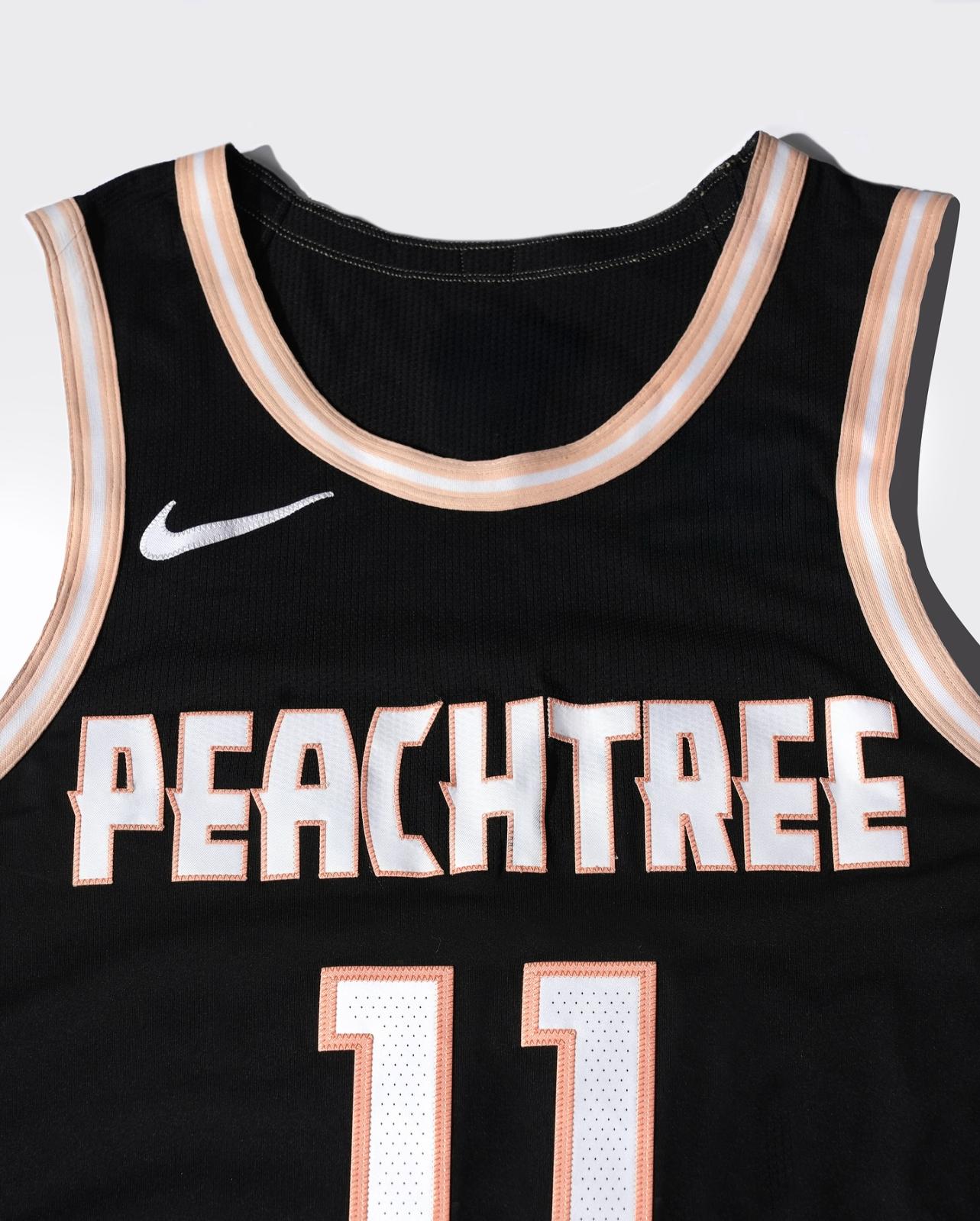 The design is a direct tribute to the city of Atlanta's famous Peachtree Street. It features a clean black base which allows the vibrant peach-colored details to stand out. The "PEACHTREE" lettering across the chest and the trim on the jersey are rendered in this signature peach hue, creating a visually striking look.
