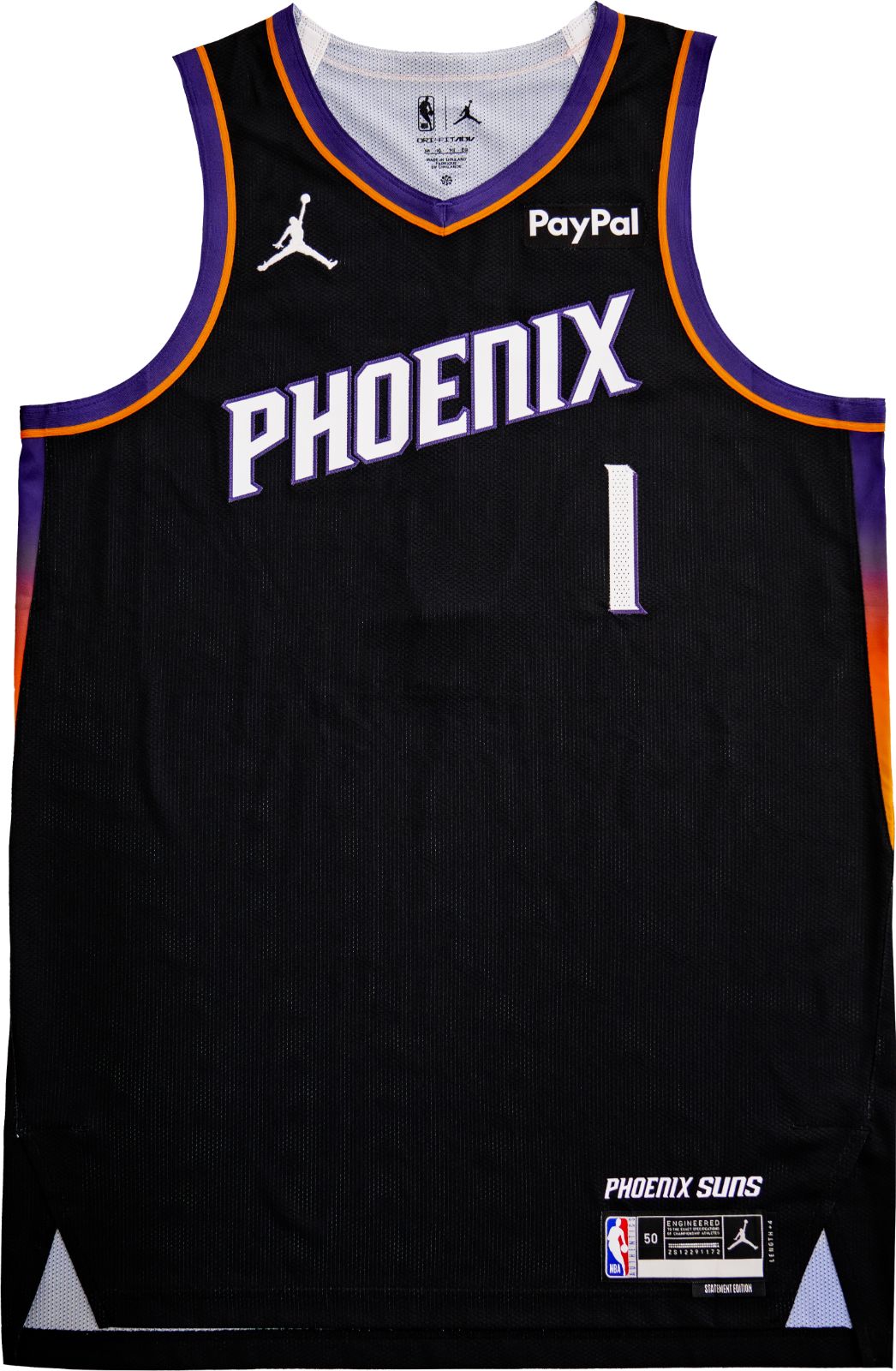 The new Statement Edition jersey features a solid black base with the "PHOENIX" wordmark across the chest. The lettering and player numbers are white but contain a subtle purple border, giving them a unique texture and pop. The uniform is accented with purple and orange trim along the collar and armholes and includes a gradient effect on the side panels that transitions from purple at the top to orange at the bottom.