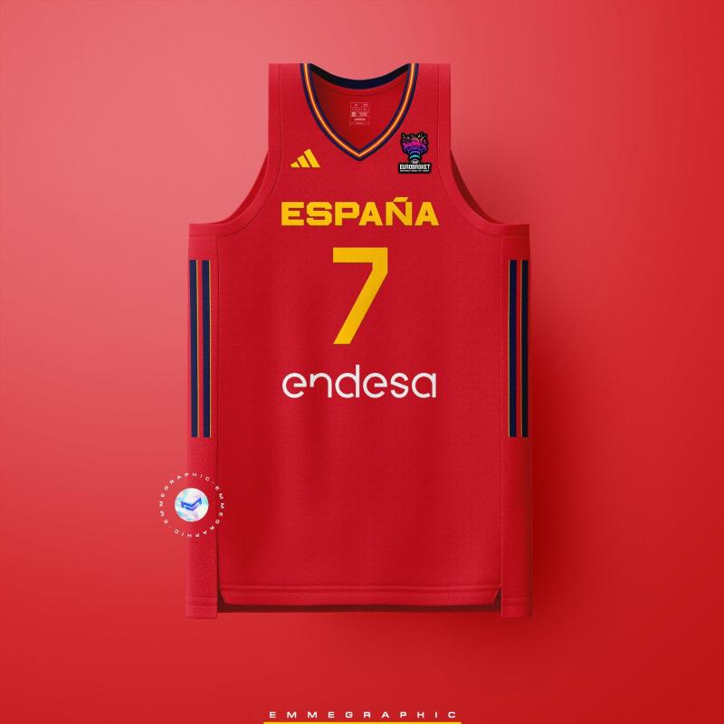 Spain will take on France in the 2022 FIBA EuroBasket tonight. Inspired by what promises to be a very competitive match-up, sportswear graphic designer Emmegraphic has created concept home shirts for both teams, inspired by the respective countries' 2022 FIFA World Cup shirts.