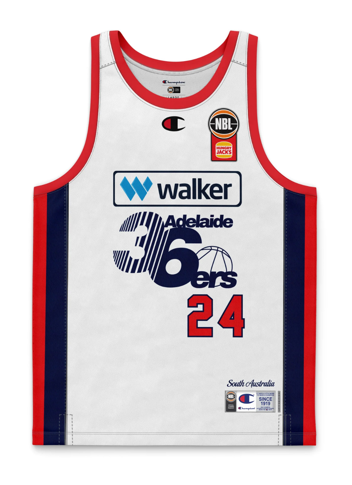 Adelaide 36ers 2024-25 Heritage tenue, gemaakt von Champion en gedragen in het NBL 2024-2025 seizoen. Het Adelaide 36ers 2024-2025 Heritage shirt is beoordeeld met - sterren van de 5.