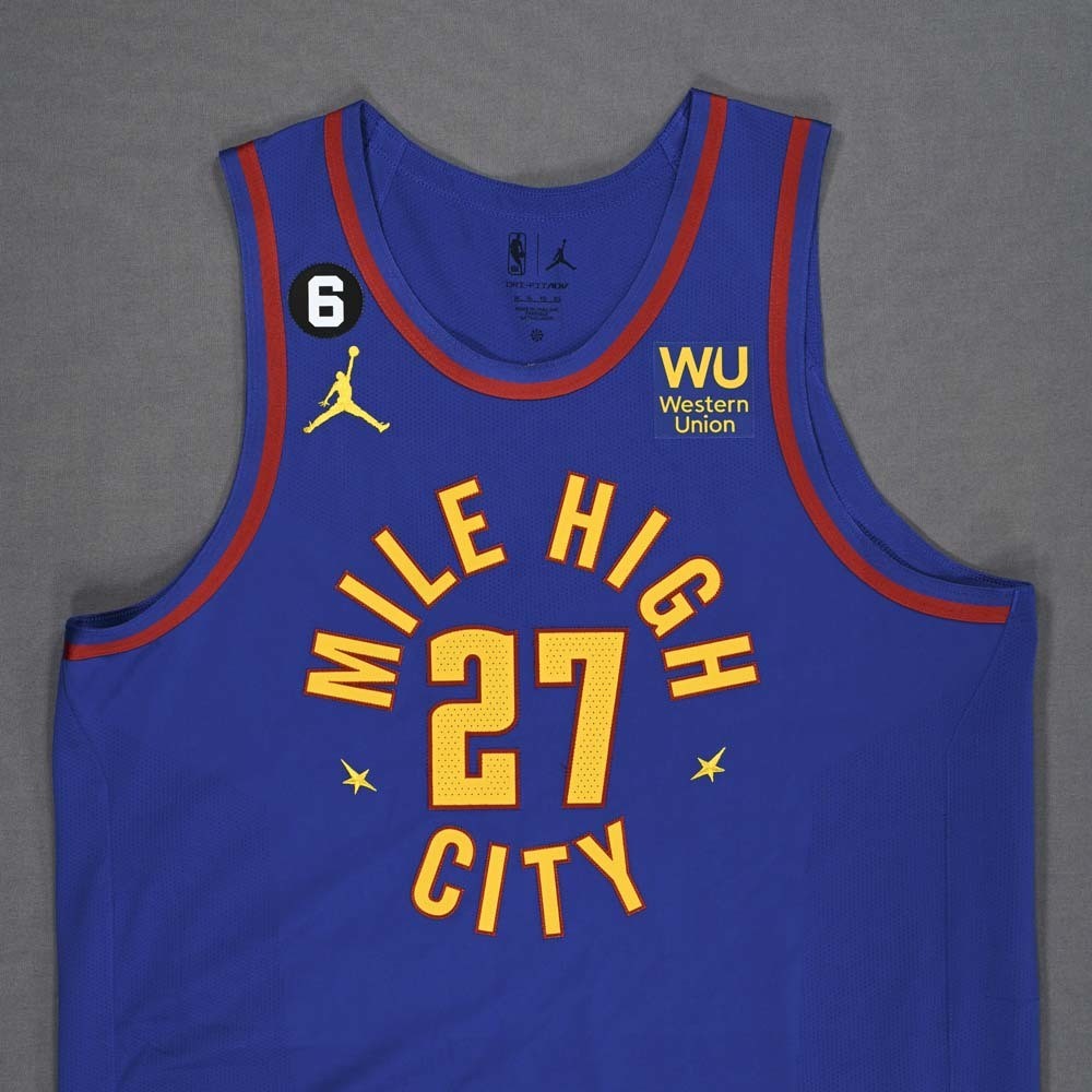 Denver Nuggets 2022-23 Statement tenue, gemaakt von Air Jordan en gedragen in het NBA 2022-2023 seizoen. Het Denver Nuggets 2022-2023 Statement shirt is beoordeeld met 3,5 sterren van de 5.