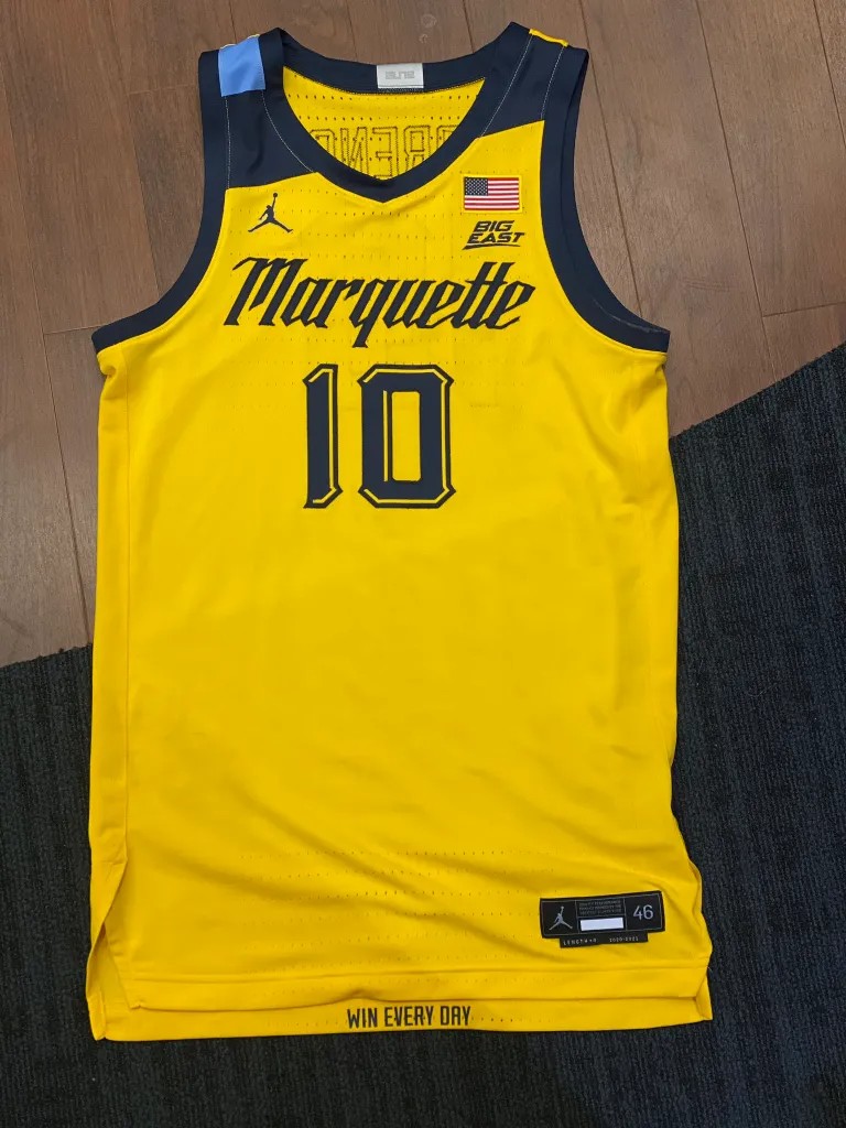 Marquette Golden Eagles 2020-21 Home tenue, gemaakt von Air Jordan en gedragen in het NCAA 2020-2021 seizoen. Het Marquette Golden Eagles 2020-2021 Home shirt is beoordeeld met 4,3 sterren van de 5.