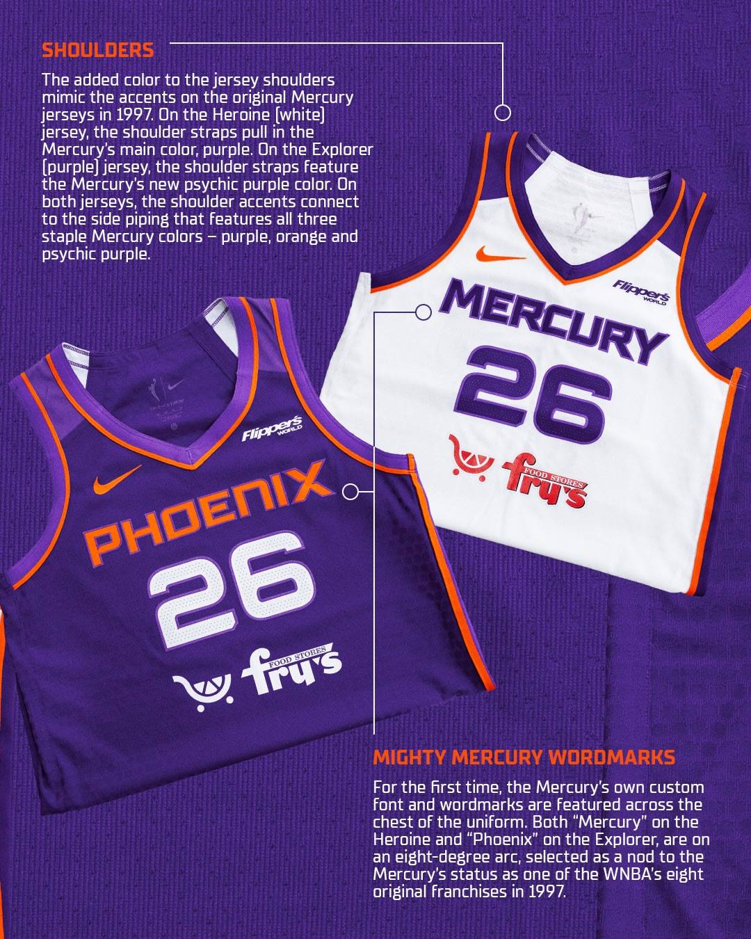 The white Phoenix Mercury Heroine Edition jersey features "MERCURY" displayed prominently across the chest. This, along with the player numbers, is rendered in the team's new, exclusive "Mighty Mercury" typeface which is the first time in the franchise's history that the numbers have been in a custom font. Both the wordmark and numbers are outlined in a newly introduced "psychic purple" color. As a tribute to the team's inaugural uniforms, the jersey incorporates colored shoulder straps. The wordmark itself is set on an eight-degree arc, a subtle detail honoring the Mercury's status as one of the WNBA's eight original franchises.