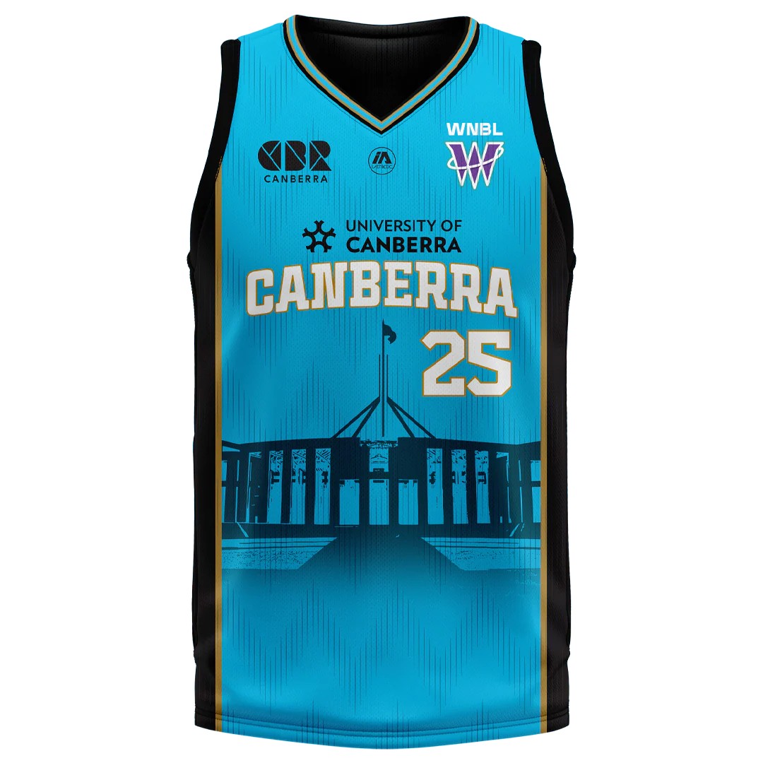 UC Capitals 2025-26 HoopsFest tenue, gemaakt von IAthletic en gedragen in het WNBL 2025-2026 seizoen. Het UC Capitals 2025-2026 HoopsFest shirt is beoordeeld met - sterren van de 5.