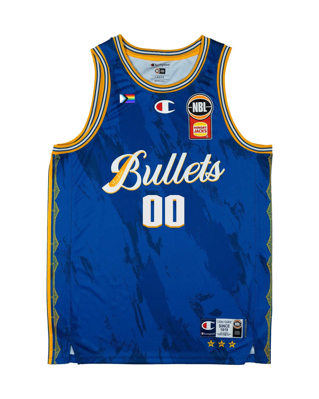 Strój Brisbane Bullets 2025-26 Pride, wyprodukowany Przez Champion i noszony w sezonie NBL 2025-2026. Koszulka Brisbane Bullets 2025-2026 Pride jest oceniana na - gwiazdek z 5.