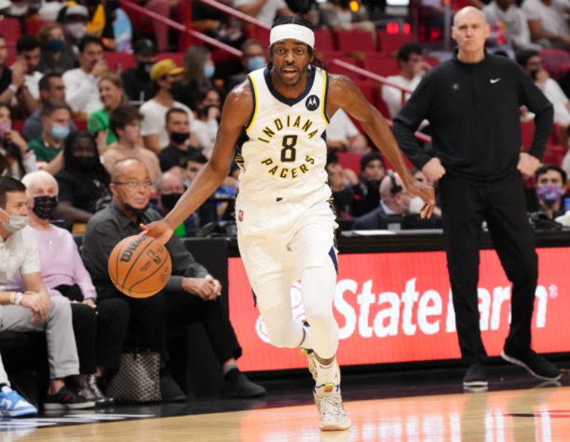 Jogadores Buddy Hield, Caris LeVert, Tyrese Haliburton, Domantas Sabonis, Myles Turner e Malcolm Brogdon.