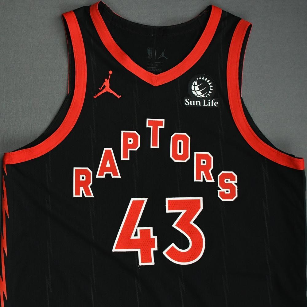 Uniforme de Toronto Raptors 2020-21 Statement, feito por Air Jordan e usado na época de NBA 2020-2021. A camisola Toronto Raptors 2020-2021 Statement é classificada com 2,9 estrelas em 5.
