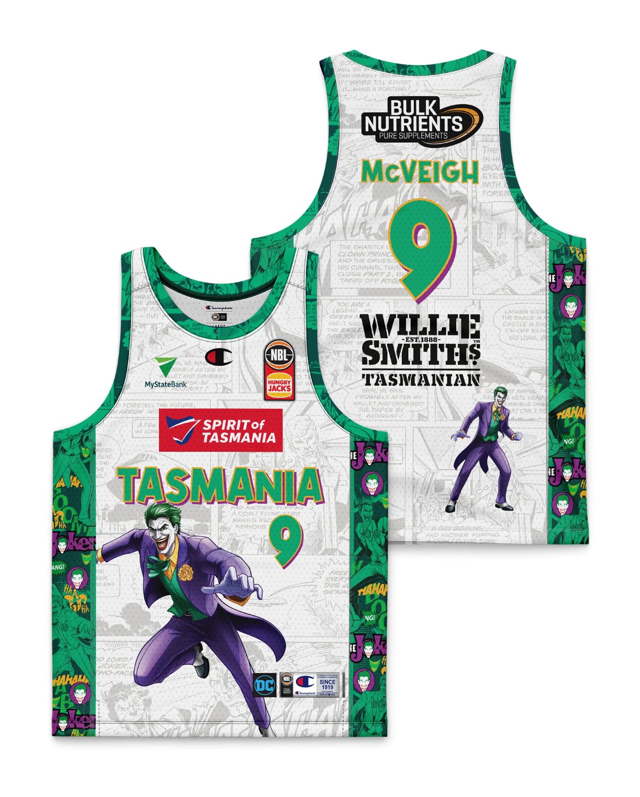 O design oficial da camisola e dos calções NBL X DC Away para os JackJumpers da Tasmânia apresenta a arte da personagem ...