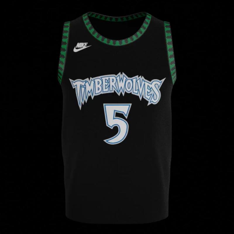 The legendary "tree" trim design is back for the Minnesota Timberwolves. This Classic Edition jersey, which features black trim with stylized green trees around the collar and armholes, is one of the most unique and popular throwback designs in the NBA.