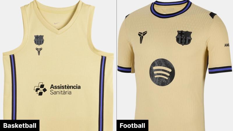 While both jerseys honor Kobe Bryant with a matching gold & purple color scheme, they adapt the design for their respective sports. The basketball jersey features long vertical stripes down the sides, while the football kit incorporates the trim on its collar and sleeve cuffs. Aside from the cut, the most significant visual difference is the main sponsor logo, which is Assistència Sanitària for the basketball team and Spotify for the football team.