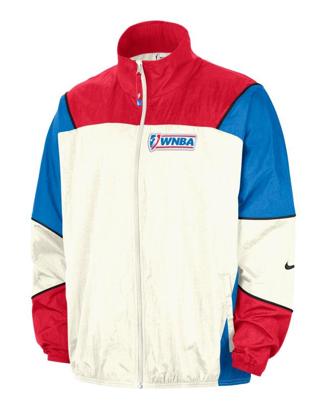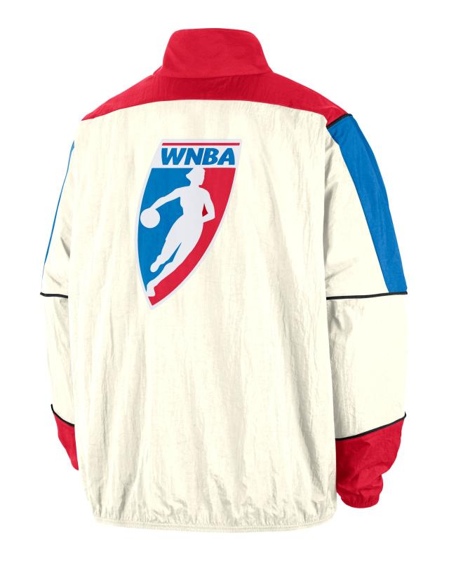 Accompanying the jersey is a matching woven track jacket. It utilizes a vintage color-blocking design with a cream-white body, red upper chest and collar, and blue sleeves. The classic WNBA logo is prominently placed on the left chest, while a subtle black Nike Swoosh sits on the lower sleeve.´